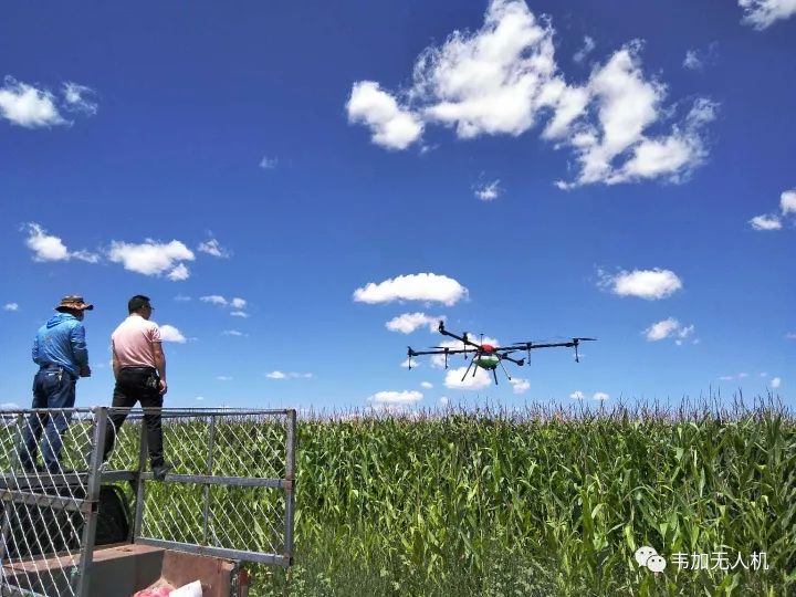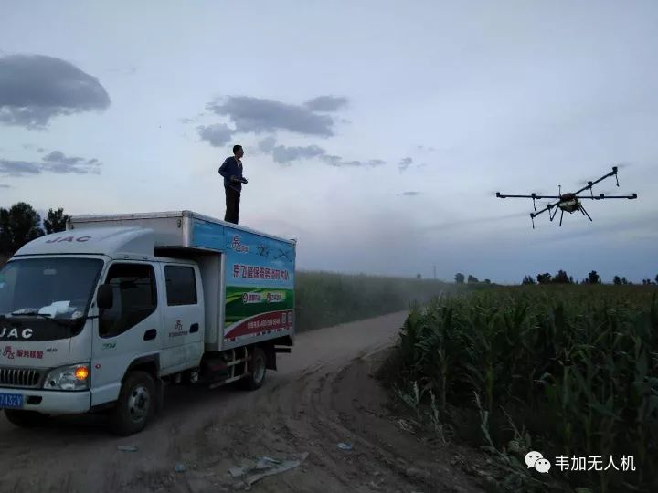 马达轰鸣,机翼飞旋,韦加植保无人机闪亮登场,开始在玉米地上空喷洒农药。灾情紧急,当地植保服务队陕西派福特商贸有限公司立刻向北京韦加无人机科技股份有限公司请求驰援。韦加公司的无人机和技术人员连夜赶往榆林,8月5日凌晨4点到达定边县,6点就开始打药,30余架20公斤级植保无人机在重灾区的玉米地来回穿梭,喷过药的田里,2个多小时后粘虫陆续倒下,田间的农民啧啧称赞。