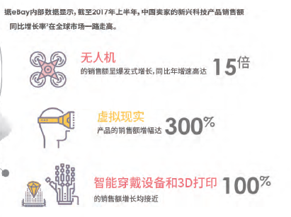 题为《领跑未来——eBay新兴科技品类跨境电商零售出口产业报告》(下称《报告》)显示,今年上半年,通过ebay中国出口平台,智能家居、无人机、3D打印、虚拟现实、智能穿戴设备正以最高增速引领所有电子品类,成为继智能手机之后,最新的五种爆款销售增长点。