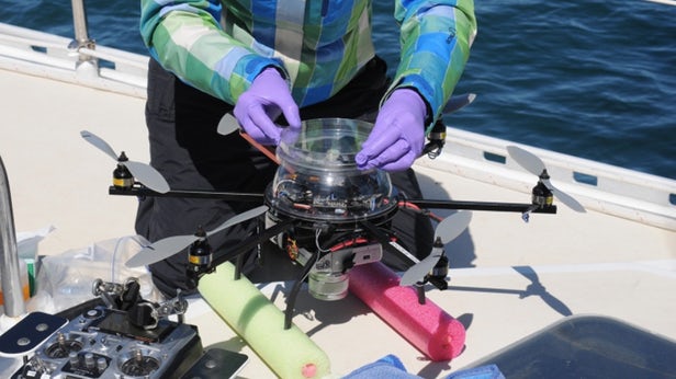 研究人员将携带灭菌的培养皿放在无人机顶部。 无人机能够飞到许多健康座头鲸喷水孔的正上方。无人机一共搜集了科德角17头鲸鱼和加拿大温哥华岛附近的9头鲸鱼的样本。