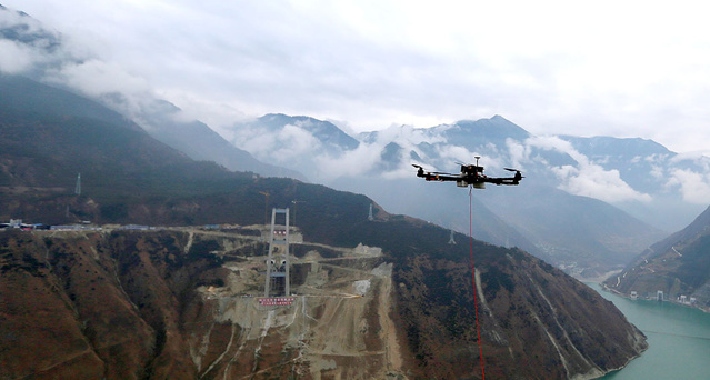 全长1100米的川藏第一桥雅康高速泸定特大桥架缆,是国内第二次采用无人机牵引先导索施工的。
