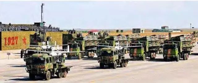 朱日和阅兵上亮相的无人机方队,右侧橙色头的为祝小平和周洲研制的反辐射无人机。