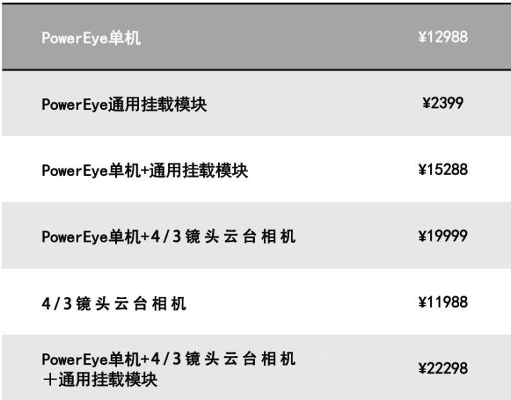 PowerEye黄金眼通用挂载模块将陆续登陆全球市场进行销售,大陆地区的官方售价为人民币2399元。此外,PowerEye黄金眼单机将单独出售,售价为12988元;4/3云台相机的售价为11988元,PowerEye单机+4/3云台相机的价格为19999元。我们同时还为大家提供了其他几种不同的套装,为消费者提供组合购买优惠,具体价格如下: