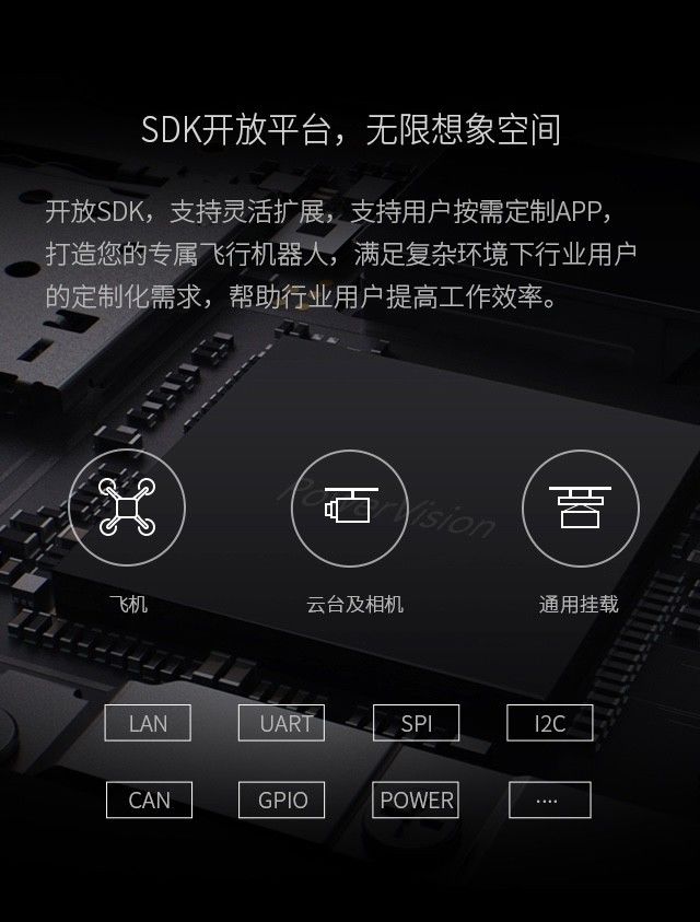 PowerEye通用挂载模块全面支持SDK开放平台,并提供丰富的网络接口,支持个性化开发,帮助无人机实现丰富的应用拓展,为无人机爱好者及不同行业用户应用需求提供稳定而全面的系统级解决方案。