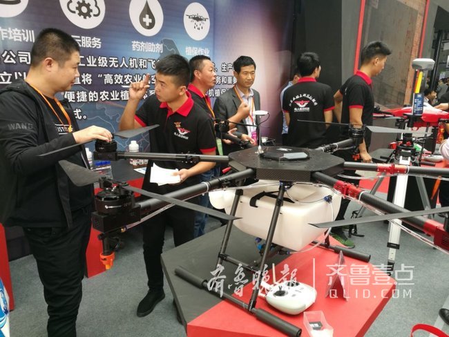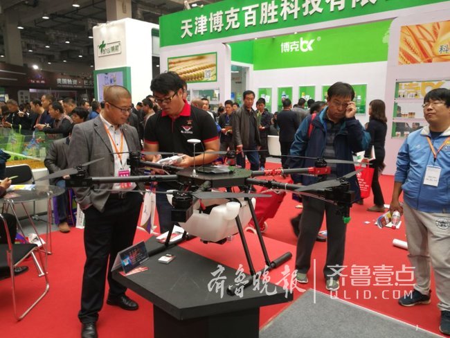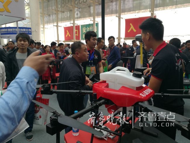 进入济南国际会展中心大厅,在靠近大厅门口的山东鸟人科技有限公司的植保无人机展区,几架无人机吸引了众多参观者的眼球,不少参观者都围在展位前,听取工作人员的介绍。