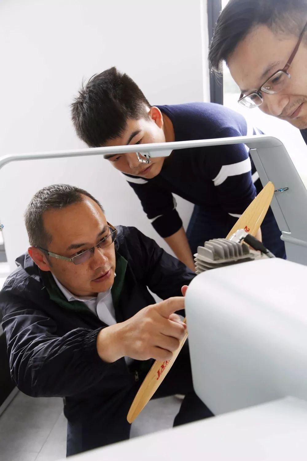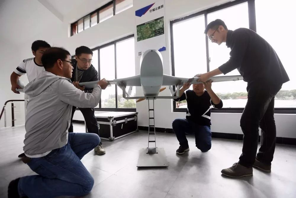 ▲基地工作人员观察一架无人机的结构。无人机在出厂前,飞控、气动布局等每一个环节都要进行试验。试验不能在公众场合或人口稠密区进行,在基地内能够保证试验安全。