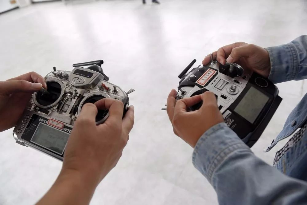 ▲两名操作人员手持无人机遥控器,互相交流试飞经验。