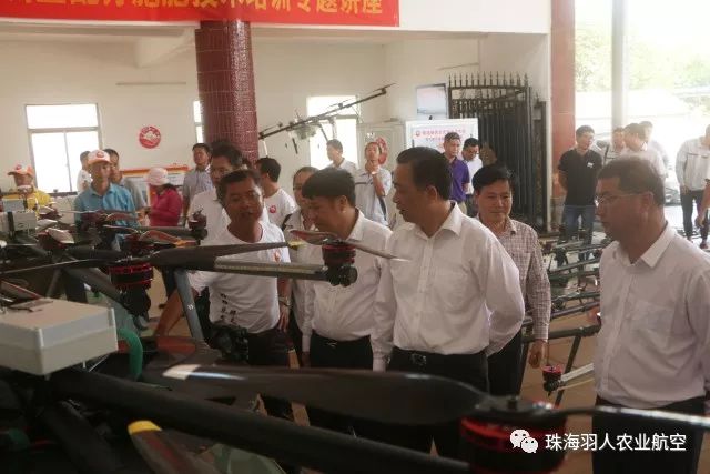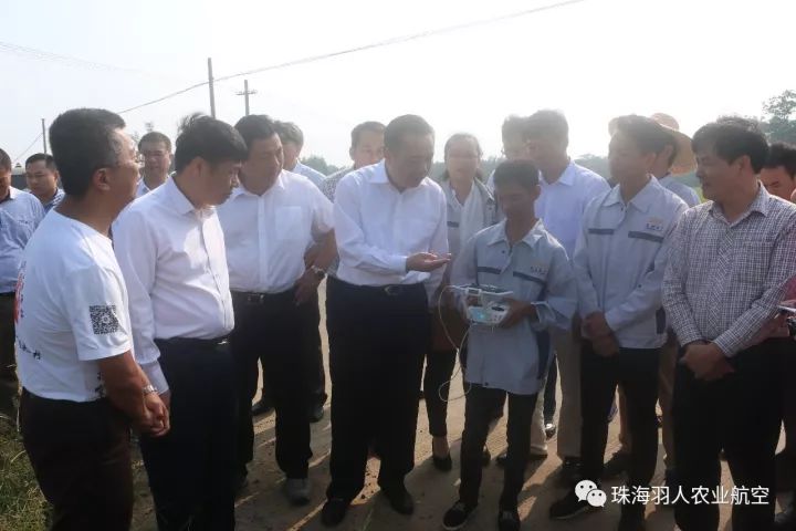 在观看过程中,珠海羽人副总经理蔡秀琼向一行领导介绍我们在精准扶贫村开展无人机植保服务情况。省厅长郑伟仪听取后,肯定了我们珠海羽人先进的植保无人机技术在整个湛江推进扶贫产业项目的理念方向,鼓励植保无人机能够深入加快应用和推广开来,为精准扶贫农业机械添一份力。