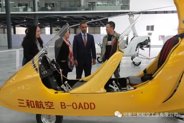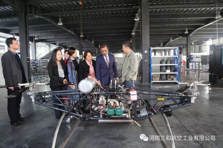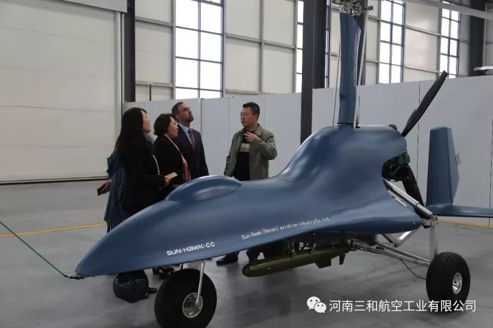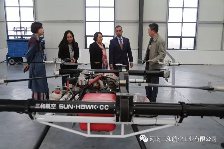 2017年10月24日,波多黎各大学国际事务总监路易斯(Luis)、国际事务首席代表玛利亚(Maria)、国际合作培训总监托娅(Tuoya),在郑州通航试验区管委会办公室主任黄玉鹏等领导的陪同下,参观考察了我公司自主研发生产的“太阳之鹰”自转旋翼机、“穿云鹰”无人旋翼机、“祥云320”载人无人机、“天眼”垂直起降复合翼无人机和“阿凡达”飞行摩托。