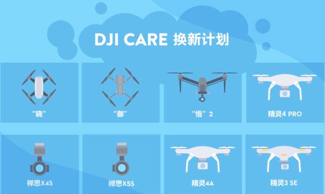DJI CARE换新计划支持大疆最新发布的系列产品:“晓” Spark、“御” Mavic Pro、“悟” Inspire 2、精灵 Phantom 4 Pro、禅思 Zenmuse X4S、禅思 Zenmuse X5S、精灵 Phantom 4 Advanced、精灵 Phantom 3 SE、“御” Mavic Pro铂金版、禅思 Zenmuse X7。