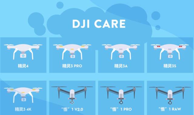 早期产品也在DJI CARE服务范围内:精灵 Phantom 4、精灵 Phantom 3 Professional、精灵 Phantom 3Advanced、精灵Phantom 3 Standard、精灵 Phantom 3 4K、“悟” Inspire 1 RAW、“悟” Inspire 1 Pro。