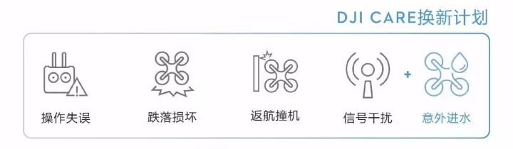 在DJI CARE换新计划中,由操作失误、信号干扰、返航撞机、意外事故、跌落损坏和意外进水所导致的事故,都可以受保。