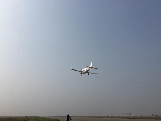 26日午间,AT200飞机驱散重雾,一飞冲天。飞机经过滑跑、起飞、爬升至预定高度后,进入巡航段并盘旋两周,随后进入着陆航线平稳着陆,整个飞行过程持续26分钟,全程飞机状态稳定,航迹跟踪精确,达到设计要求。