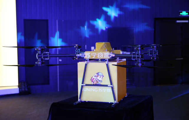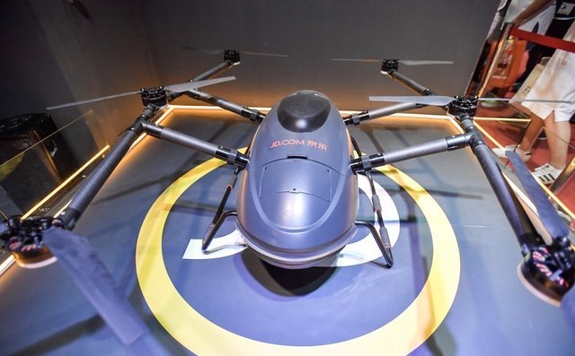 北京,京东携多款机器人亮相世界机器人大会。图为京东配送无人机。