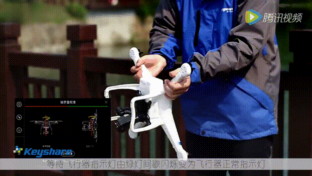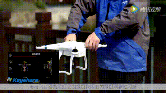 等待飞行器指示灯由绿色快闪变为绿灯间歇性闪烁,此时我们将飞行器机头朝下机尾朝上,顺时针旋转飞行器,