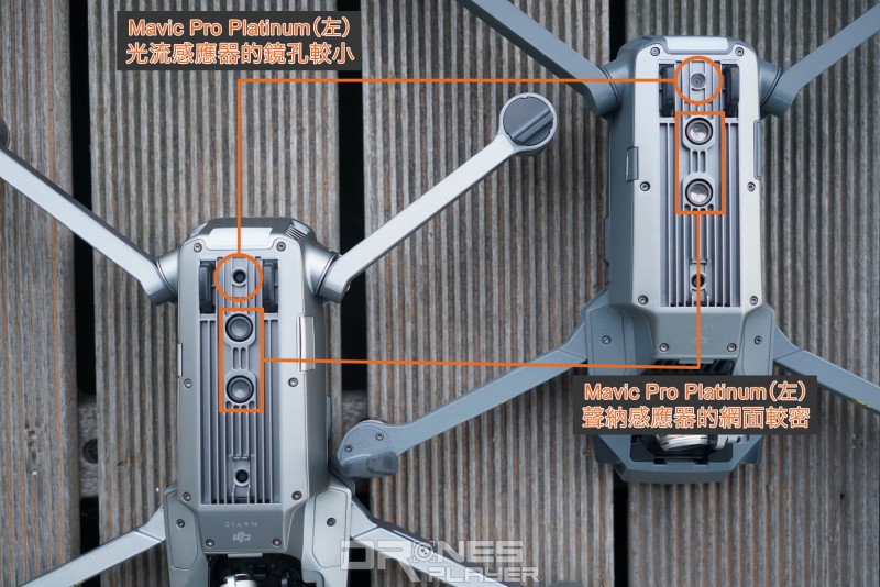 电池效能是续航力的基本因素,那Mavic Pro Platinum 的电池与上一代有没有分别?答案:并没有!两机的电池同是 3830 mAh 、43.6 瓦时。反而,Mavic Pro Paltinum 底板的光流及声纳感应器配件有点不同,如下图所示,但未知两组组件的效能是否有变。