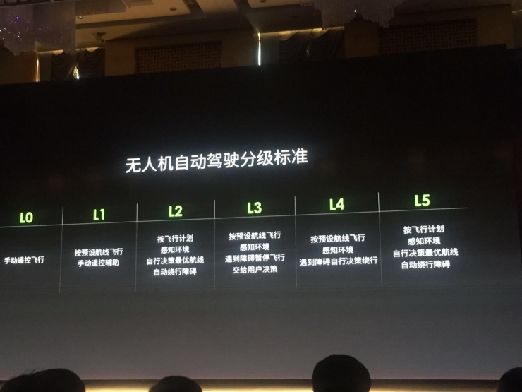 目前,无人驾驶系统基本上形成了普遍认同的分级标准,彭斌对无人机的自动化驾驶也做了分级,从L0到L5。彭斌认为目前极飞的无人机达到了L4的阶段,明年争取达到L5。