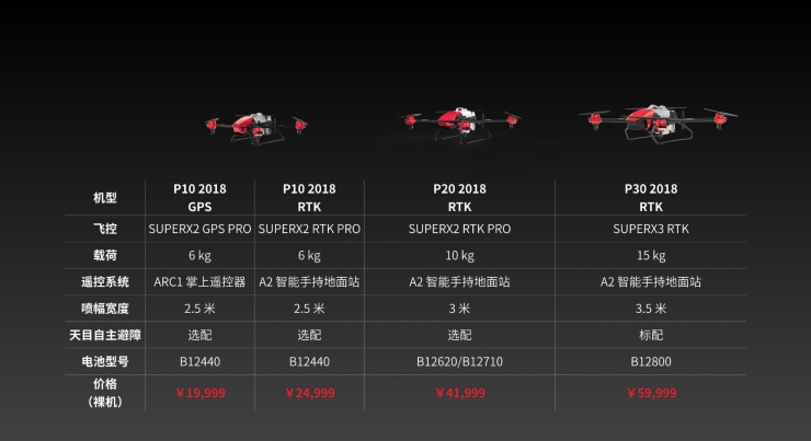 P30 2018则是三款植保无人机中在技术上表现最为抢眼,搭载全新SUPERX3 RTK 智能飞行控制系统和XAI农业智能引擎,集成 GNSS RTK高精度定位系统,并与XCOPE天目自主避障系统无缝协同,令飞行控制更加稳定流畅;全新毫米波雷达仿地和光流辅助定位,适应全部地形的植保作业。极飞首次将人工智能技术应用到植保无人机上——AI 故障预判功能,能及时提醒用户可能存在的故障,最大限度减少安全隐患;AI处方图技术,自动为不同农作物病虫草害匹配最佳喷洒方案,开启精准喷洒的智能化革命。