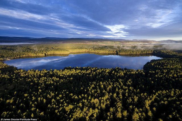 凯恩戈姆山国家公园里,清晨的第一缕阳光洒在Loch Garten周围的松林。