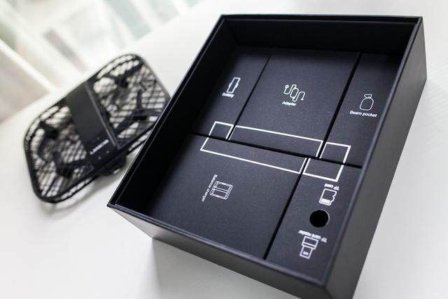 ▲打开外包装那一刻觉得会有一点眼熟,看上去是不是有点像那个什么“小黑侠”’?仔细一看还是有区别的,毕竟不是所有的“烧烤架”都叫“小黑侠”,想想四轴无人机好像也都长得一个样。底层是配件层,各种配件都摆放得非常规整,几条烫银指示线和标识图标显得非常上档次,细节做得很到位。
