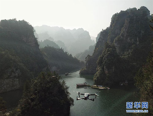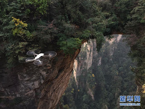 摄影师遥控无人机拍摄张家界武陵源“天下第一桥”。