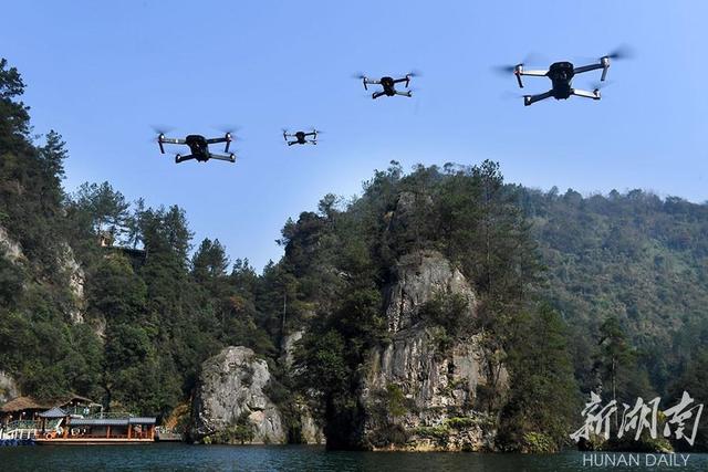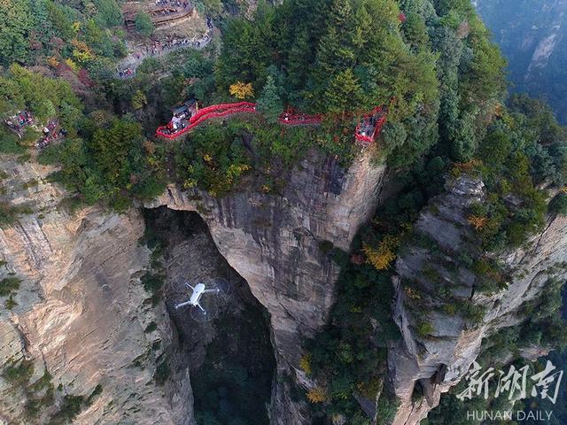 11月4日,无人机在武陵源核心景区进行航拍。当天,2017年首届“大疆·武陵源航拍旅行节”在素有醉美情湖之称的张家界宝峰湖风景区拉开帷幕。启动仪式上,张家界市武陵源区与DJI大疆创新达成战略合作,将“航拍旅行文化”融入景区品牌推广,共同打造全球“无人机友好型景区”和“大疆航拍旅行示范地”。