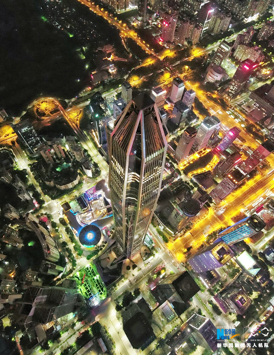 近日,新华网新闻无人机队广东中队,以7.5MM超广角的镜头,在接近800米的高空,对深圳福田CBD夜景进行航拍报道。图为,深圳市民中心地段。