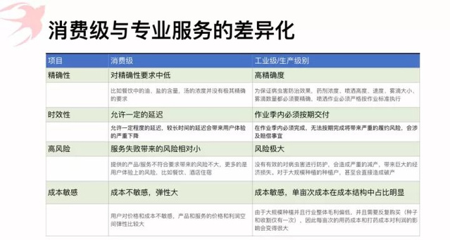 极飞、雨燕和大象淝从设备、平台和原料端展示了农业领域技术和模式创新的一个侧面,尽管不是所有行业应用领域都像农业这样庞大而复杂,但行业场景下的需求相比消费级产品一定是具体、细化得多的,对行业场景的理解深度决定着科技公司在这些场景上能派上多大用场,开拓出多大的市场。同时,即使是在同一领域,行业市场的需求,以及厂商满足需求的方式也是多层次、立体化的,这也为厂商的模式技术创新提供了更大的空间和可能性。