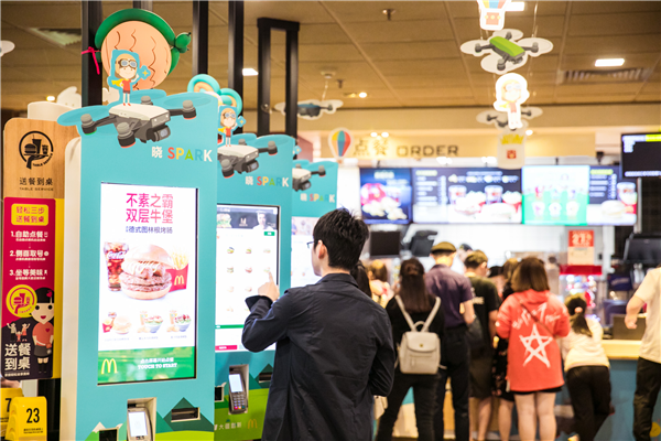 在麦当劳门店中,大疆将适合家庭使用的掌上无人机“晓”Spark装扮在餐厅的每个角落;门店电视上循环播放活动视频和无人机飞行安全小知识;餐厅中随处可见的飞行元素,给麦当劳增加了一份“科技”气质。