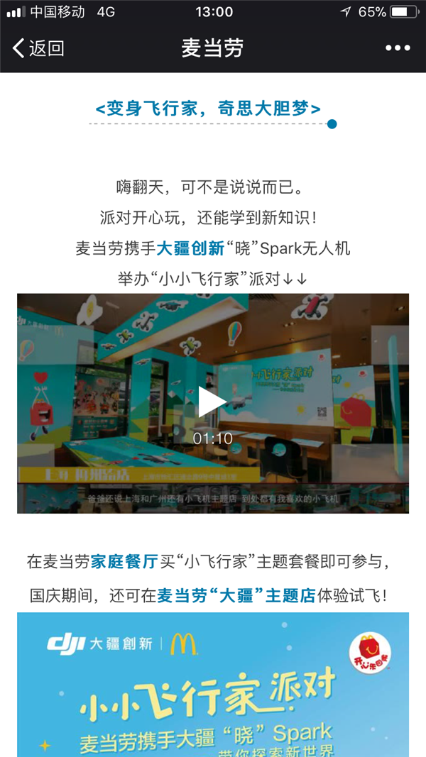 作为两个领先企业在国庆黄金档的重点活动,双方都拿出重点资源进行推广。大疆、麦当劳中国的官方微信、微博均对活动进行反复推送。