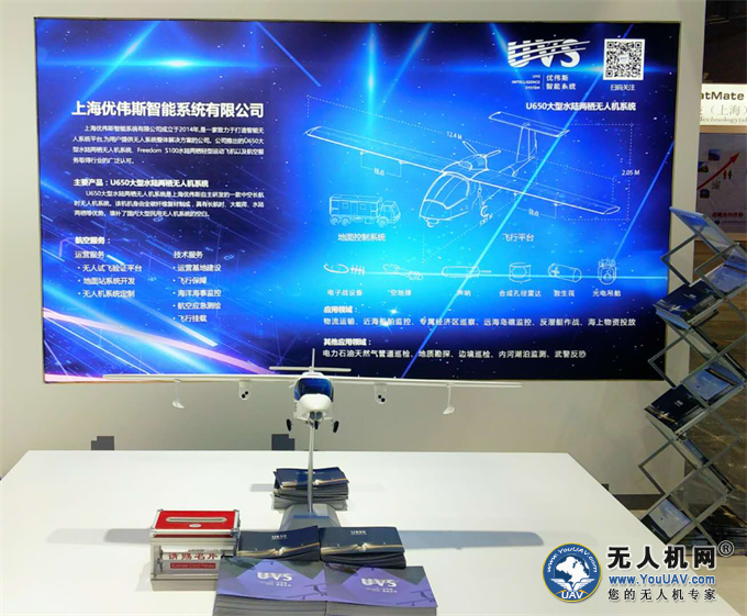 优伟斯智能系统有限公司(UVS Intelligence System)是一家创新型和技术型的公司,主要是为用户提供无人系统整体解决方案的公司。优伟斯U650公司研发历程历时三年,自2015年12月首飞后, 2016-2017年分别完成水上和陆上的研发试飞。U650大型水路两栖无人机,其翼展12.4米,最大续航时间15小时,最大有效载荷250kg,使用普通95#或以上汽油,全碳纤维复材机身可适应多种环境应性。于此同时,其最大的特点就是采用可收放式起落架,可在普通公路、草地、水面/海面实现全自主起降。作为中空长航时无人机,U650侦察监控构型可携带多种高性能载荷设备,如光电吊舱、雷达、声呐、船舶自动识别系统,完成不同的侦察监控任务。U650水陆两用无人机凭借其大载荷和水路两用的特点可以很好的应用到物流行业。