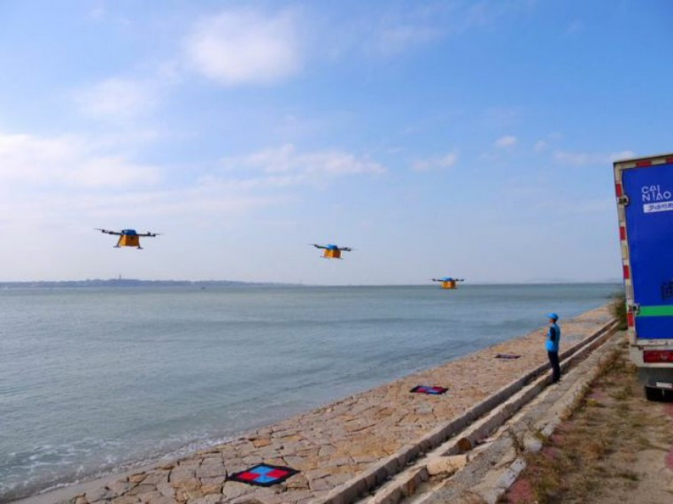 10月31日,福建省莆田市山亭镇,阿里巴巴菜鸟网络的无人机群组,满载湄洲岛居民下单的六箱货品,为农村淘宝提供物流服务。仅耗时9分钟就成功飞越海峡,宣告国内首次无人机群组跨海快递飞行成功。