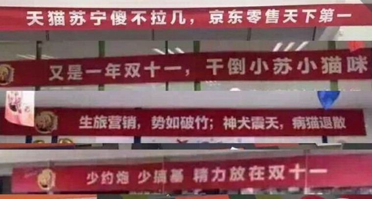 相比天猫和煦如风的暖心风格,京东“神犬震天,病猫退散”、“干掉小苏小猫咪”、“抓天猫烤菜鸟”等戾气满满的标语则被网友痛批心胸狭隘,格局太LOW
