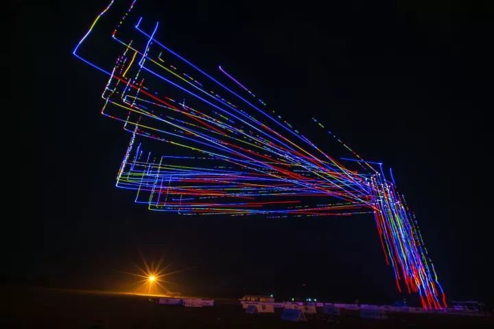 当晚我们用延时摄影记录了当晚400台无人机的飞行轨迹,宛如进入了科幻世界一样,瞬间有种穿越时空之旅的感觉,在黑夜的映衬下刷出了N道亮丽的风景线。