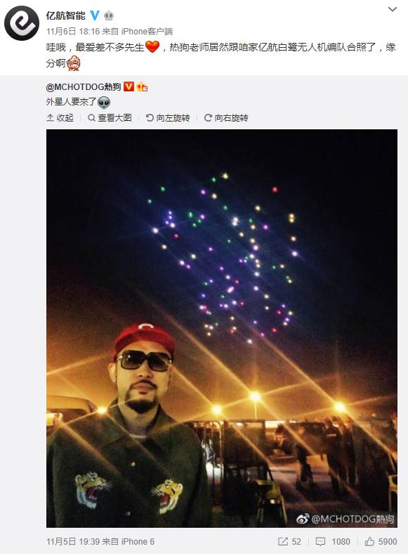 没错,答案就是“外星人”——来自亿航白鹭的天外来客!在当晚,我们动用了400台无人机在现场“献技”表演!居然让嘻哈大神McHotDog偶遇抓拍留念,也是缘分!