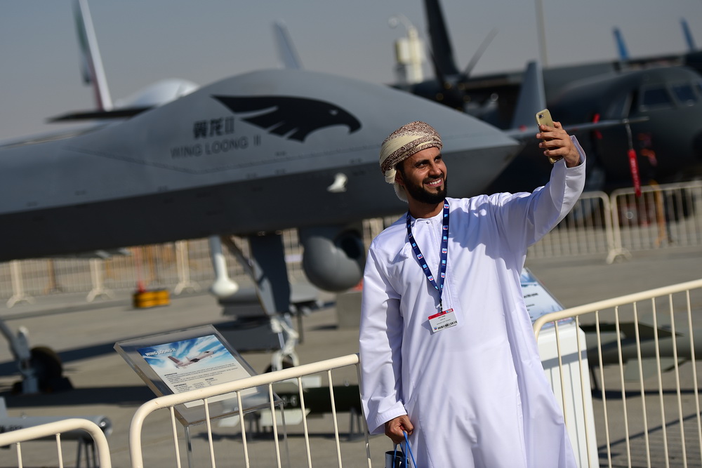 11月13日,在阿联酋迪拜航展上,一名参观者在“翼龙”无人机全尺寸模型前自拍。