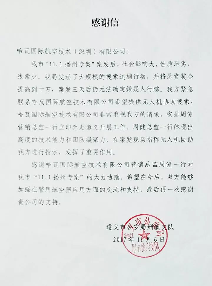 行动结束后,遵义市公安局领导对哈瓦无人机的贡献予以了肯定,并书写感谢信一封表示感谢!