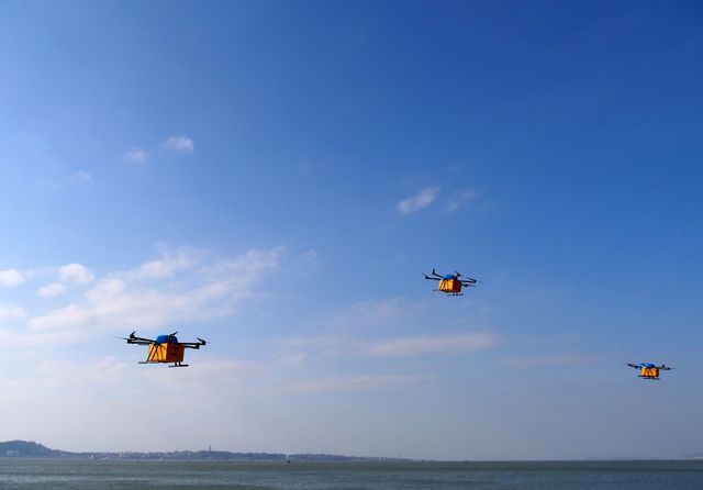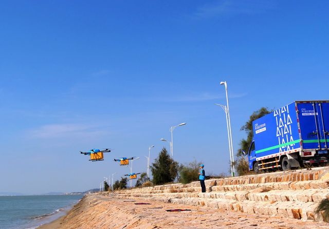 在物流人员的注视下,三架无人机同时拔地而起,队形统一,准备跨海。