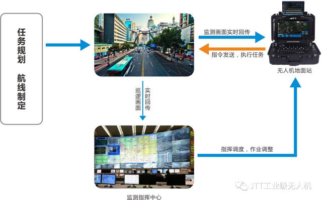 JTT无人机应急指挥调度平台可将无人机飞行平台与城管部门系统无缝隙地连接成一个有机整体,解决无人机在城管执法单位应用中存在的技术难点及应用盲区。JTT无人机应急指挥调度平台依托公网3G、4G以及专网4G LTE等多种无线网络技术实现无人机空中实时视频监控并传送相关画面或视频到移动指挥平台,后台系统根据相关视频或画面进行智能识别和分析,汇总得出相关人员、车辆、现场与周边情况为指挥人员或相关领导提供人力部署、应急处理提供决策依据和技术保障。