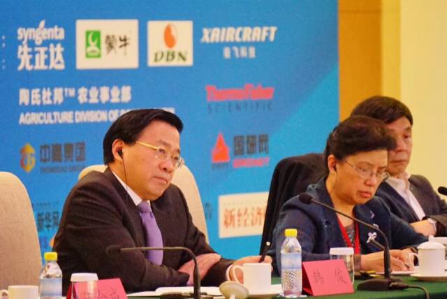 由中央农村工作领导小组办公室一局局长、研究员赵阳主持的对话环节:把小农生产纳入现代农业轨道,保障粮食与食品安全,对话嘉宾:中国供销集团董秘陈静波、日本农林水产省国际部国际地域课长山口博之、中德农业中心项目主任霍康德、陶氏杜邦农业事业部大中华区总裁黄田强、极飞科技联合创始人龚槚钦