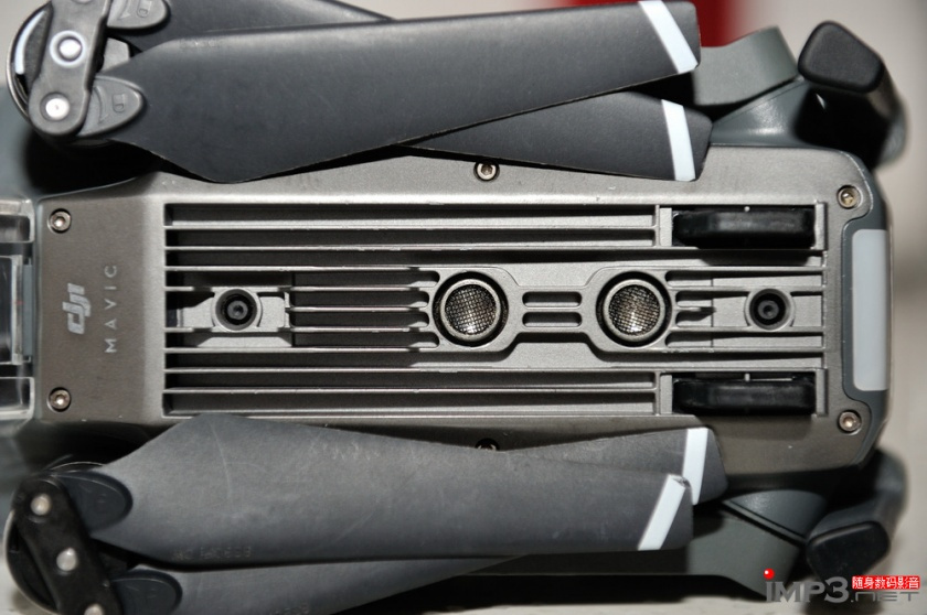 Mavic Pro肚子下面有两个超声波传感器和两个摄像头传感器,能够识别飞行的高度,能够实现安全和精准降落等人性化功能。