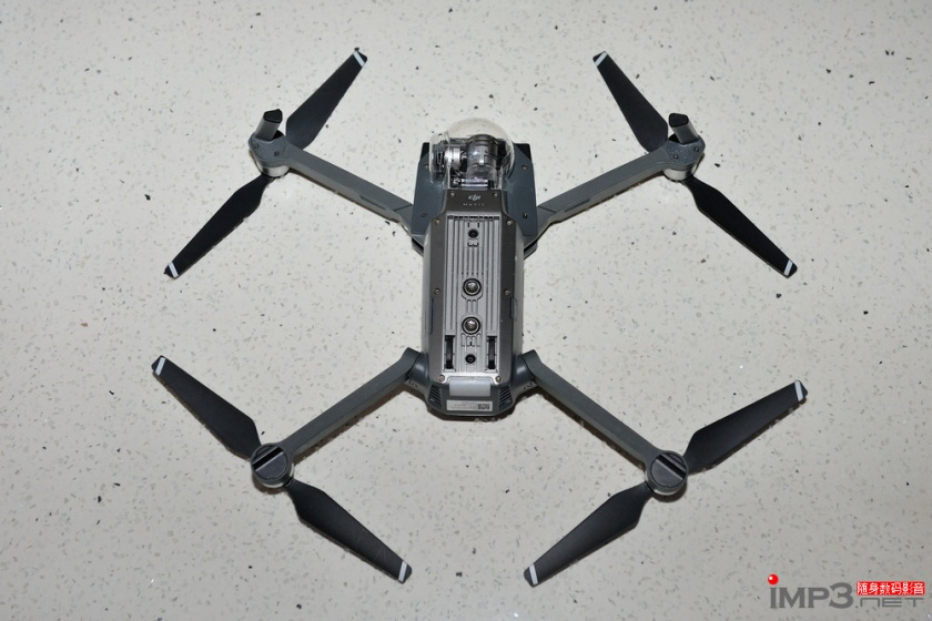换个视角看Mavic Pro,肚子底下还是蛮复杂的,各种传感器、摄像头,它的起落架有两个在旋翼下方,两个在机身下方,看起来并不明显,也不占用额外的空间。另外它的无线电发射天线直接做在了其中两个前起落架上,可谓是一举两得,还有利于信号的传送和接收。