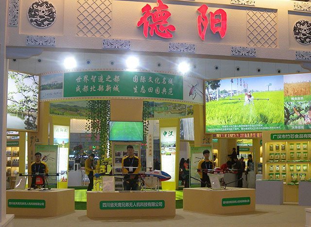 德阳馆展区,四川天鹰兄弟植保无人机精彩亮相,展示了植保绿色机械先进技术。在很多地区,无人机打药已经司空见惯,无人机植保方式已经被广大农户认可,农户也越来越接受无人机防治的效果。这次展会天鹰兄弟植保无人机成为了众多合作社、家庭农场以及种粮大户等咨询的重点。