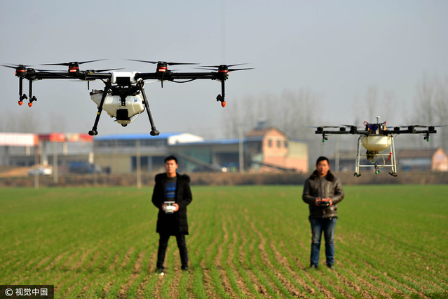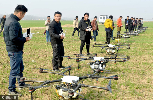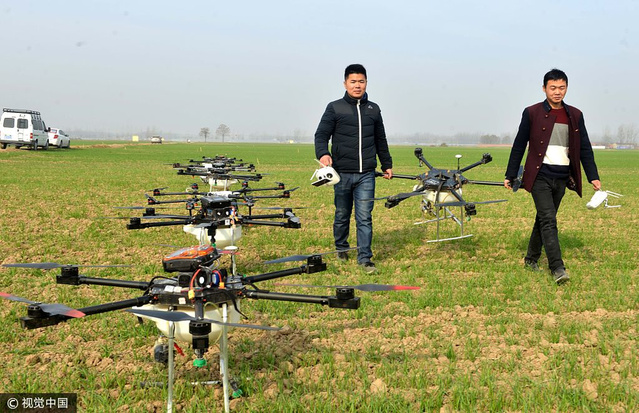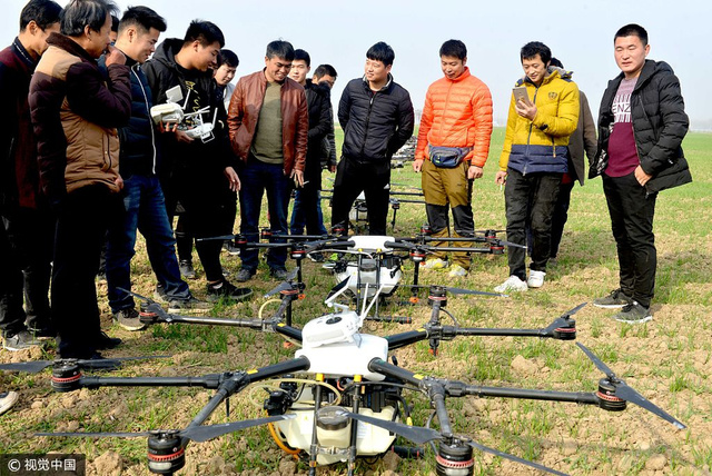 2017年11月21日,今年以来,河南省商丘市夏邑县胡桥乡新桥村村民朱希望联合本村十几个贫困户,一次性购置30台无人机,他们组成植保无人机编队,为全国各地的种植专业合作社和种植大户的农作物提供有偿喷药作业服务。村民在为农业增效提供保障的同时,也开辟了一条脱贫致富路。 图片来源:苗育才/视觉中国