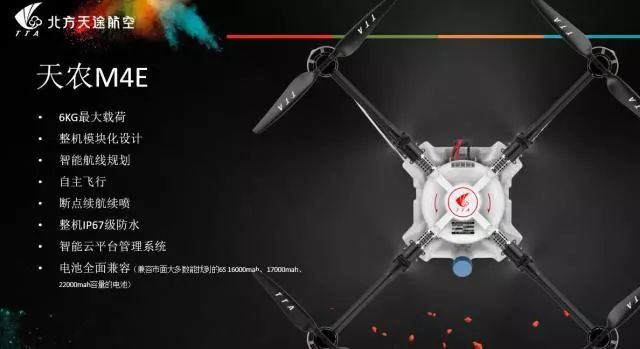 会议期间,天途陆续推出了多款机型,M4E尤受关注。M4E是一款最大载荷为6公斤的四旋翼无人机,整机采用模块化方式组装,全机身防水等级为IP67级,具备智能航线规划、自主飞行、断点续航续喷等功能,也兼容市面上的多款电池。这款无人机售价19999元,包括飞机、飞控系统、遥控器和植保无人机培训(教材、教程)。这也是天途为无人机“创业联盟”力推的高性价比产品。
