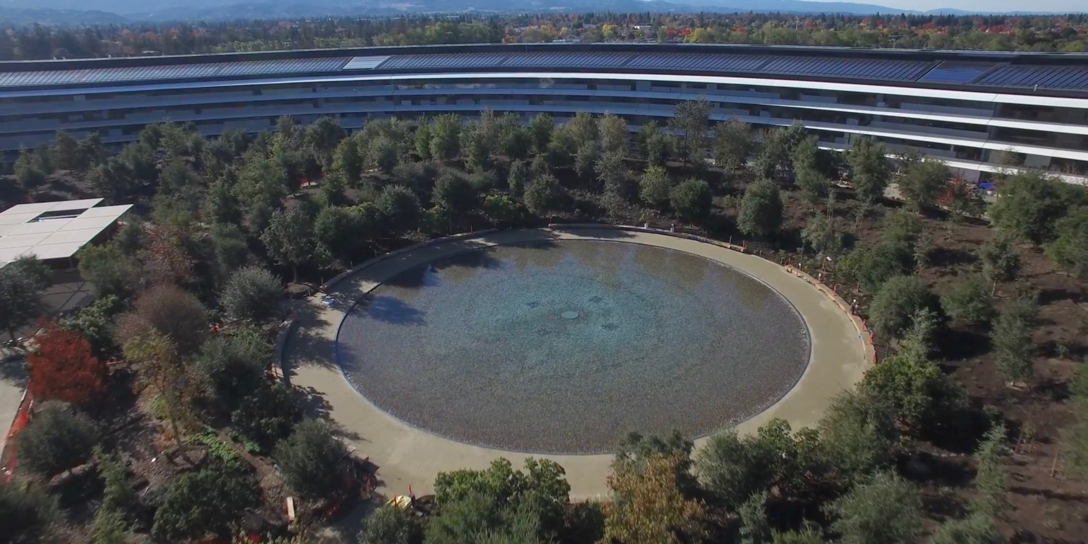 主园区在园林绿化方面已经取得了很大进展,在自助餐厅巨大的双层玻璃门外面种植了茂盛的青草与树木,中心的池塘里也注满了水。户外食品站已接近完工,环形建筑屋顶上的太阳能电池板都已安装完毕。库克之前已经表示过,整个 Apple Park 将完全依靠屋顶太阳能面板提供的可再生能源进行运作。