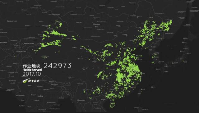 截至 2017 年 10 月,极飞在全国的植保服务总面积超过1500 万亩次,每天平均调度运行超过40000 架次的植保和测绘无人机飞行,已经累计为超过240,000 个地块进行了测绘和喷洒作业。