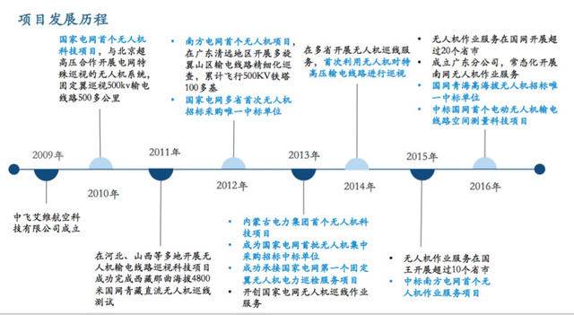 团队2010年起开始与国家电网北京超电压合作,开始研发电网特殊巡线的无人机系统。2011年在河北、山西等地开展无人机输电线巡线项目,并在4800米海拔的西藏地区进行了测试。2012年团队成为国家电网多省首次无人机招标采购中唯一中标单位,并于同年与南方电网开展首个南网无人机项目。2013年开始承接国家电网固定翼无人机电力巡检服务项目,并与内蒙古电力集团开展合作。2015年中标南方电网首个无人机作业服务外包项目在广东开展无人机巡线服务。截至今日,公司已经在超过20个省市开展了巡线作业。