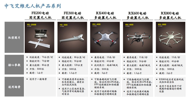 与其他行业应用无人机不同,巡线无人机对防风、防火、防尘、防电磁、防静电等都有较高的要求。团队经过调研发现,市面上的无人机还很难满足这样的要求,为此花费多年时间,研发了包括RX400、RX600、RX800电动多旋翼无人机、FE200、FE300电动固定翼无人机在内的多款无人机机型,采用一体成型设计,重量轻、风阻小,续航时间30分钟-70分钟不等,可搭载1-3公斤不等的载荷,可适用于普通场景及地形复杂、气候异常的场景,结合团队多年积累的巡线作业经验以及专业的飞手团队,中飞艾维在市场上频获佳绩。