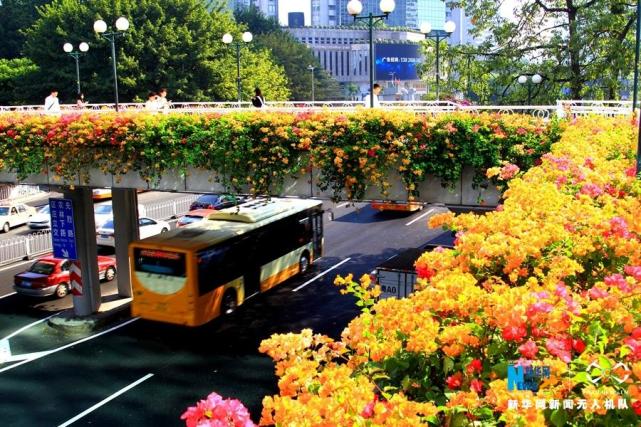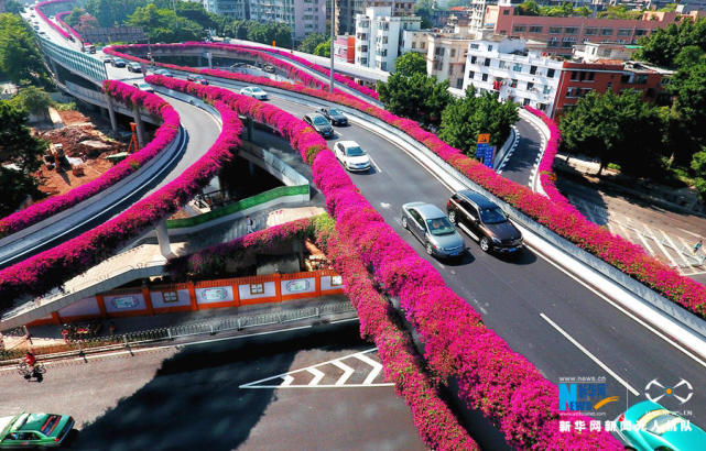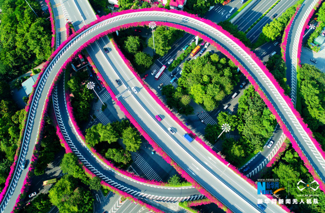 航拍客村立交桥,簕杜鹃为它戴上一圈“花环”。