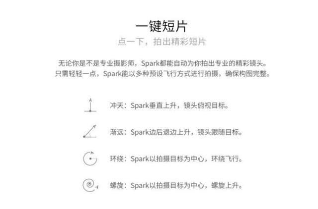 Spark 最大的优点就是更加智能,如果你是新手那这台飞机真的是在再适合不过了,起飞的时候可以点击屏幕上的一件起飞。降落的时候也可以选择一件降落,省去了自己降落时候因为操作不稳造成机器重跌在地上的麻烦。